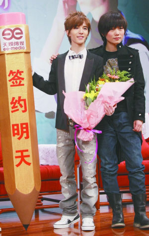 昨天的簽約儀式上,天娛當(dāng)家花旦許飛(右)獻花歡迎“師弟”郭敬明。