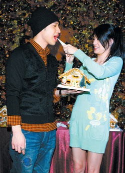 潘瑋柏(左)手不靈活,江語(yǔ)晨代勞喂他吃奶油。