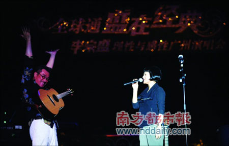 張艾嘉的出現(xiàn)令觀眾極為興奮。這個(gè)被李宗盛稱為“大姐”的女人一上臺(tái)就調(diào)侃李宗盛:“在歌壇里,小李是我的最愛,那你的最愛是誰?”讓李宗盛無言以對(duì)。她唱起了《我這樣愛你到底對(duì)不對(duì)》、《因?yàn)榧拍罚不忘輕松地在舞臺(tái)上表現(xiàn)兩個(gè)人的友情:“你們看過小李演的電影沒有?他演的多數(shù)是喜劇,悲劇也能演成喜劇,每次都演我的丈夫或者男朋友,唉,我真的很不幸……”此外她還逼問:“你的歌都很浪漫,不知道你是不是一個(gè)浪漫的男人?”李宗盛據(jù)實(shí)以答:“把渴望而不可得的寫入歌中,我的實(shí)際人生很沉悶的!睆埌巫詈蠛鼙挤诺貏裾f他:“再找個(gè)好點(diǎn)的,再生個(gè)妞!庇浾 齊帥 攝影 馬強(qiáng)