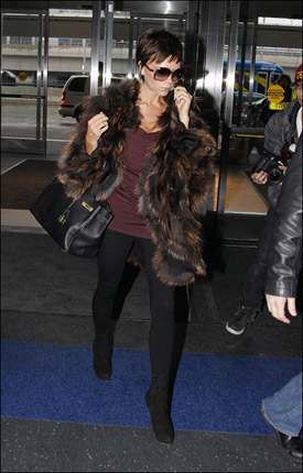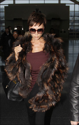 剛剛結(jié)束了阿瑪尼第五大道開業(yè)典禮活動的維多利亞·貝克漢姆又馬不停蹄的換回了雷人的裝扮,摘掉了藍(lán)色的發(fā)卡,換上了皮草大衣,這次的衣服毫無貴婦裝扮可言,遠(yuǎn)遠(yuǎn)看去就像是一只被火燒到毛的火雞,實(shí)在是雷人不淺,唯一值得一提的還是黑面上的那副墨鏡,還是蠻好看的。