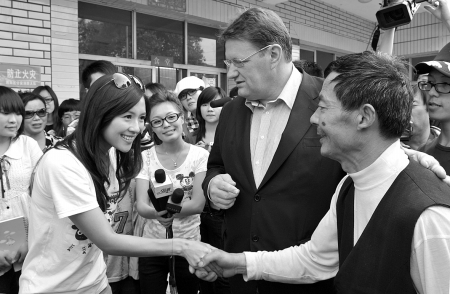 在探望中,一位大爺來到章子怡身邊。院長(zhǎng)吳德玉向章子怡介紹,這是福利院的門衛(wèi)大爺。在去年5·12地震發(fā)生時(shí),為了救被困在院里的孩子,大爺不顧危險(xiǎn)翻墻進(jìn)去,不慎摔傷了自己的雙腿。章子怡很感動(dòng),她突然伸出右手高呼:“向抗震英雄學(xué)習(xí)!”并佩服地對(duì)大爺說:“你是英雄,你是超人!”