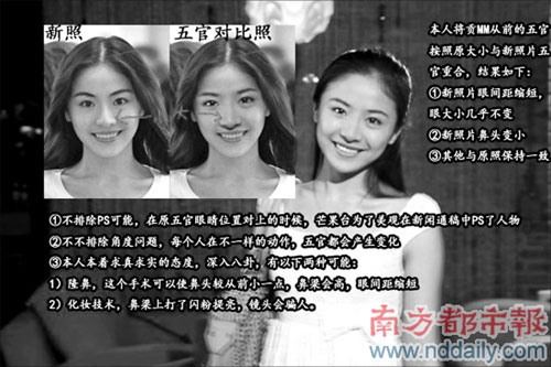 本人將貢M M從前的五官按照原大小與新照片五官重合,結(jié)果如下: