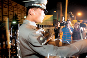 今晨3時(shí),一輛警車開(kāi)出大門(mén)右拐彎之后停在了便道上。兩名保安下車后,打開(kāi)后面的鐵柵欄門(mén),放出兩男一女。早已疲憊的記者們頓時(shí)從門(mén)口的臺(tái)階上跳起來(lái),跑到警車后面,閃光燈閃個(gè)不停。
