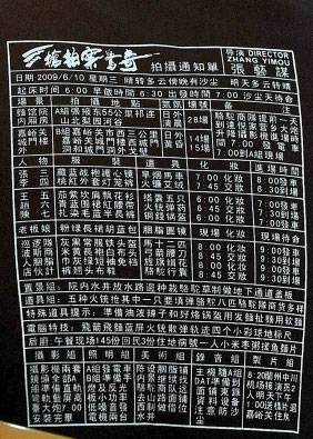 記者從這份泄密的拍攝通知單上發(fā)現(xiàn):今天拍攝的將主要是張三(孫紅雷)和李四(小沈陽(yáng))之間的對(duì)手戲,其余人物還有王五、趙六以及陳七、老板娘、巡邏隊(duì)、波斯商、人胭脂、店伙計(jì)。拍攝道具則包括旱煙、馬車、火鐮、搭囊、火筒彈藥、弓箭、腰刀等,另有駱駝以及馬12匹?磥斫裉炫臄z的大部分都是外景。有意思的是,這張拍攝通知單上還有一條“特殊道具提示”:油潑辣子、烙鍋盔用發(fā)面,扯面用軟面。而午餐現(xiàn)場(chǎng)是145份,說明這個(gè)劇組規(guī)模還是不小。細(xì)心的工作人員還注明:“住地病號(hào)一人:小米棗粥搓魚面片!笨磥碇八鶄鲃〗M伙食不錯(cuò)的消息果然不假。