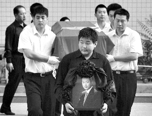 追悼會(huì)現(xiàn)場,水晶玻璃棺材四周布置著上萬朵百合花、白玫瑰花,靈堂肅穆安靜,羅京身著黑色西服、彩色領(lǐng)帶,遺態(tài)安詳。羅京妻子、愛子,以及所有親屬排成一列,陪伴羅京走完最后一程。羅京的妻子面容憔悴,低頭不語。靈堂外挽聯(lián)橫批“沉痛悼念羅京同志”。由于現(xiàn)場前來的群眾太多,工作人員不得不細(xì)心地提醒大家,“咱們就不鞠躬了,看一看羅老師就走,謝謝大家配合。”