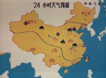 《天氣預報》節(jié)目開播最初,每天的文稿都是由氣象臺負責撰寫,然后傳真給電視臺;所用的圖就一張24小時預報圖,它是整個節(jié)目的“當家花旦”,播報員就是圍繞著它說話的。那時候沒有什么技術(shù)含金量,每天都用手繪完成(鉛筆畫好之后再用鴨嘴筆描粗),畫好后中央臺派車來取。