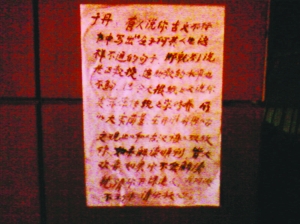 昨天上午,記者突然從某網(wǎng)站上發(fā)現(xiàn)了一個(gè)有關(guān)于丹來(lái)寧做講座的帖子,打開帖子一看,記者不禁嚇了一跳。原來(lái)發(fā)帖人周二晚上路過(guò)鳳凰國(guó)際書城時(shí),意外發(fā)現(xiàn)外墻上貼了一張匿名的小紙條。紙條上的留言挑釁意味明顯,甚至帶有一些恐嚇色彩。該發(fā)帖人于是用手機(jī)將紙條拍成照片,貼在了網(wǎng)上。