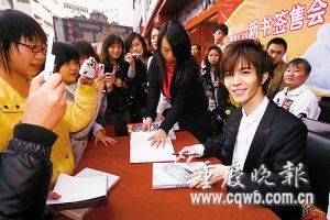 簽售開始,氣氛更加火爆。走到簽名桌前的粉絲激動不已,排到后面的則一臉焦急。一位粉絲貼心地告訴郭敬明“下次不要遲到了”,另一位粉絲直接向郭敬明表白“我愛你”,說完后緊張地拍了拍胸口,舒了口氣。郭敬明很有經(jīng)驗,一點不驚慌,微笑著說了聲謝謝。之后他接受記者采訪時表示:“重慶的女孩確實比較火辣!