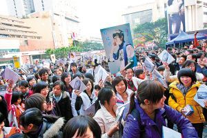 從早上8點開始,沙坪壩重慶書城前就開始有郭敬明的粉絲前來。一位15歲的女孩告訴記者,她是早上9點鐘到的,中途吃飯時花10塊錢雇了個棒棒幫忙排隊,其余時間都站在這里。女孩的媽媽也陪同前來,但比女兒害羞,不愿意接受采訪,不停地?fù)踝∽约旱哪樧層浾卟灰乃。女兒卻很踴躍:“我們?nèi)叶际切∷牡姆劢z,但我爸爸覺得男娃兒來不好,才沒有來!倍F(xiàn)場大多數(shù)都是十幾歲的女孩,記者4點半到達(dá)時已經(jīng)聚集了近千人,把沙坪壩重慶書城門口圍得水泄不通。
