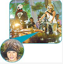 臺(tái)灣“蘋(píng)果日?qǐng)?bào)”消息,《熊貓人》2名男主角都是周董力挺的好友宇豪與彈頭,女主角則是“新版J女郎”江語(yǔ)晨,全是一家親。該劇日前在大直美麗華取景,他們戲服頗有卡通味,其中彈頭白汗衫配披風(fēng),頂著金毛佩戴熊貓面具,不像“熊貓人”,反倒像“金毛獅王”,騎的是復(fù)古偉士牌機(jī)車;相較之下,與他對(duì)戲的演員身穿特制的熊貓俠裝,騎的是周董山寨版蝙蝠機(jī)車,看起來(lái)還比較像真正的熊貓人。