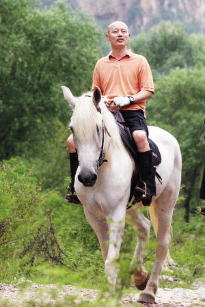 練騎馬是《讓子彈飛》演員的必修課。前段時(shí)間,廖凡、邵兵等人已經(jīng)進(jìn)組練習(xí)“馬戰(zhàn)”,現(xiàn)在終于輪到了葛大爺。葛優(yōu)的打扮十分休閑,T恤短褲輕松上陣,只是腳下長(zhǎng)長(zhǎng)的馬靴暴露出他還是為騎馬做了一番準(zhǔn)備的。上馬前,葛優(yōu)還對(duì)工作人員開玩笑地說(shuō),他以前騎過(guò)馬,只是現(xiàn)在生疏了。盡管教練特地挑了一匹性格溫順的白馬,但剛騎上馬背的葛優(yōu)還是顯得有些緊張。戴著白手套的雙手緊緊抓住韁繩,眼睛緊盯著地面,不敢抬頭。但很快,葛優(yōu)在一名助手、兩名教練的前后護(hù)衛(wèi)下逐漸放開膽子,催馬慢跑起來(lái),隨著馬跑的節(jié)奏晃動(dòng)身體,還有閑情抬頭看看山景,臉上也多了笑容,看來(lái)很快葛大爺就能在馬上跟姜文一決雌雄了。