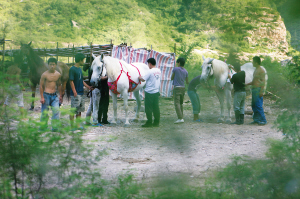 在劇組的馬棚里,記者看到了幾匹純種馬正穿著紅紅綠綠的“肚兜”遛來(lái)遛去(小圖),場(chǎng)面相當(dāng)搞笑。這種“肚兜”由一塊鮮艷的花布和4條帶子組成,帶子穿過(guò)馬匹的前腿系在它們的背上,正好包裹住馬匹的胸腹部位。大多數(shù)工作人員都不明白這種“馬肚兜”是做什么用的,只說(shuō)這是導(dǎo)演姜文的主意,只有一位工作人員透露說(shuō),這種“肚兜”是馬幫的標(biāo)致。記者 楊蓮潔