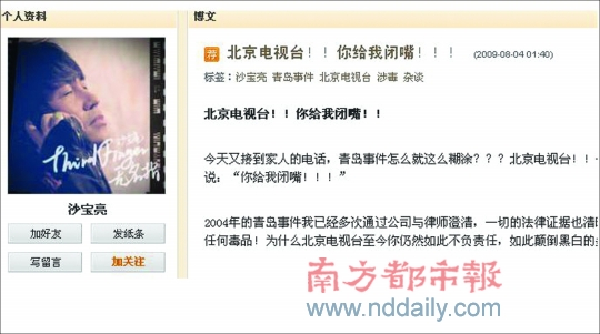 由于滿(mǎn)文軍吸毒案引起轟動(dòng)的緣故,北京電視臺(tái)近日再次報(bào)道明星吸毒事件,將沙寶亮04年卷入青島夜總會(huì)吸毒一事再度重提,并以主觀口吻稱(chēng)“沙寶亮涉嫌沾染毒品”、“沙寶亮至今仍不承認(rèn)吸毒”。前日,沙寶亮本人在個(gè)人博客上嚴(yán)正聲明:我從未沾染過(guò)任何毒品!并直接針對(duì)北京電視臺(tái)表示:“今天我最后一次很?chē)?yán)肅也很客氣地跟你說(shuō):你給我閉嘴!”