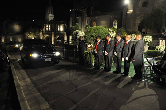 扶靈者是邁克爾的幾位哥哥。他們全都穿著同一款式的黑色西裝,以及只戴一只白手套,向他們心愛的弟弟道別。