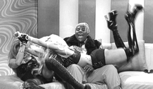 上周六播出最新一集SNL,年過(guò)半百的娜姐跟比她年輕一半的Lady Gaga,兩人穿著皮制內(nèi)衣及長(zhǎng)靴勁歌熱舞,娜姐先是挑釁地說(shuō):“跳得什么爛鬼迪斯科啊!盠ady Gaga回嘴:“麥當(dāng)娜,我比你更辣!蹦冉悴桓适救醯卣f(shuō):“我比你高,Lady Gaga這什么名字啊,聽起來(lái)像嬰兒食品!彪S后兩人扭打,主持人凱南·湯普森唯有出來(lái)調(diào)停,最后Lady Gaga干脆整個(gè)人飛撲過(guò)去,跨過(guò)凱南直接打娜姐。凱南正在發(fā)愁之際,兩位“瘋后”突然和好了,而且還當(dāng)眾親嘴。事后兩人表示互相當(dāng)對(duì)方為偶像,感情好得很。泰漁