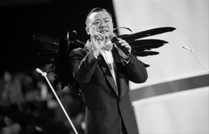 當晚,周立波一身筆挺修身的黑西裝在舞臺上亮相,只不過背后“長”出了一雙黑色的羽毛翅膀,最搞笑的是,他居然提了個小板凳,然后直挺挺地站了上去,因為他周圍的美女個頭都比他高!拔医裉斓脑煨推鋵嵤莻天使,但很多人說我像只烏鴉,但你們別把烏鴉不當鳥,別把饅頭不當點心!”