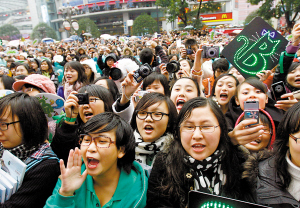 本報(bào)訊 山城昨日陰雨綿綿,不過(guò)這絲毫沒(méi)有影響到周筆暢的人氣。從中午開(kāi)始,觀音橋茂業(yè)百貨外的簽售現(xiàn)場(chǎng)就聚攏起了四面八方趕來(lái)的筆迷,F(xiàn)場(chǎng)足有近二千人,超過(guò)上一次古天樂(lè)在同一地點(diǎn)簽售時(shí)的狀況。
