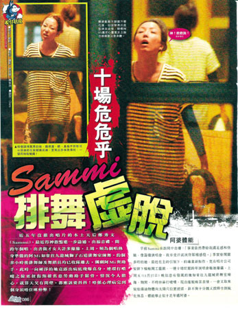 已是37歲的鄭秀文早前在訪問中表示:“事業(yè)依然帶給我滿足感和快樂,像籌備演唱會(huì),我享受汗流浹背那種感覺!鄙现苣,記者看到疑似患有感冒的她如常在九龍城排舞室練舞,其間不時(shí)打噴嚏,出現(xiàn)疲憊痛苦表情,還用藥油向太陽穴位置搓揉。她跳不夠十分鐘即坐倒在沙發(fā)休息,體能嚴(yán)重不足。她還似乎扭傷頸部舊患,痛得要助手取來藥膏按摩痛處。