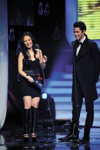 2009MTV超級(jí)盛典昨天在大劇院舉行。成龍、莫文蔚、WonderGirls、飛輪海齊齊成為座上賓,可誰都沒有阿嬌遭遇如此大的尷尬與障礙。先是因?yàn)橘澲膛c自己代言的品牌沖突,導(dǎo)致電視臺(tái)拍攝的畫面無法播出,后是在臺(tái)上與混血模特?zé)o法用英文順暢交流,令她在臺(tái)上連喊“尷尬”。