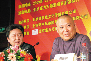 日前,“2009郭德綱圣誕喜樂會”發(fā)布會在北京舉行。郭德綱今年選擇了富力萬麗酒店,將在可容納1000人的宴會大廳里說相聲。對于最高8800元、最低1800元的高價票設(shè)定是否合理,郭德綱直言真正的“綱絲”10萬元也舍得花,這說明相聲市場繁榮了。