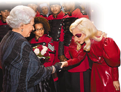 中新網(wǎng)12月9日電 一向衣著打扮出位的Lady GaGa,昨日參與英國皇家大匯演總彩排時(shí)收起奇裝異服,以鮮紅的衣著和妝容亮相。與前來捧場(chǎng)的英女王握手時(shí),Lady GaGa受寵若驚,態(tài)度卑躬屈膝。