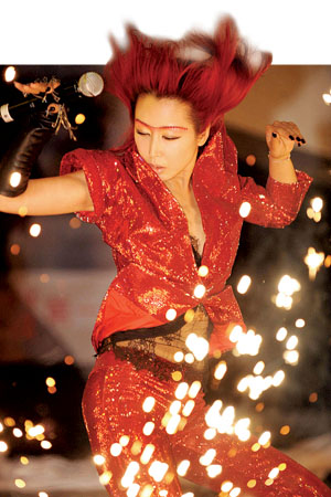 火紅的頭發(fā)、紅色亮片裝以及酷似LadyGaga(以勁爆造型聞名的美國(guó)流行音樂新晉 “舞后”)造型的激光太空鏡……歌手孫悅昨日在京發(fā)行新專輯 《變》,造型大變身。