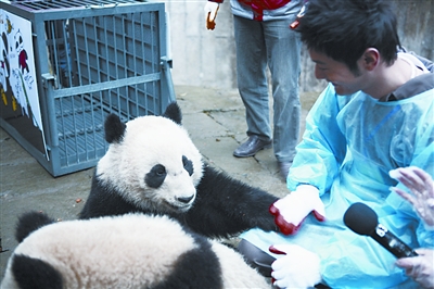 1月5日,“中國(guó)保護(hù)大熊貓研究中心熊貓愛心大使“黃曉明到雅安現(xiàn)場(chǎng),替自己的一雙“兒女”送行。由他百萬認(rèn)養(yǎng)的地震后出生的全球首對(duì)雙胞胎大熊貓“平平”、“安安”這次就將以“哥哥”、“姐姐”的身份帶領(lǐng)另外八只熊貓遠(yuǎn)赴上海世博!捌狡健彼坪跻谎劬驼J(rèn)出了“爸爸”,邊吃著早餐,另一只手很自然的就搭在了黃曉明的腿上。 記者 黃麗娟