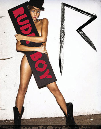 蕾哈娜這次全裸上陣拍攝新專輯封面,手中僅抱著一塊寫著牙買加流氓“rude boy”的告示牌遮住三點,嘴巴叼著一根香菸,腳上則采著一雙男用軍靴,展現她叛逆反骨的個性。
