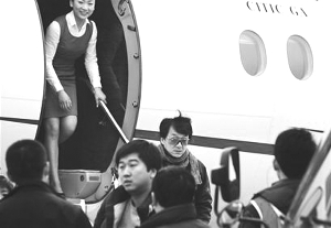 下午3:20,成龍的飛機(jī)降落在機(jī)場。幾名工作人員先行下機(jī),警覺地四處環(huán)顧,一眼就看到了攝影記者手中的相機(jī),立刻上前阻止:“成龍大哥沒有化妝,頭發(fā)很亂,還有白頭發(fā),你不能拍。”