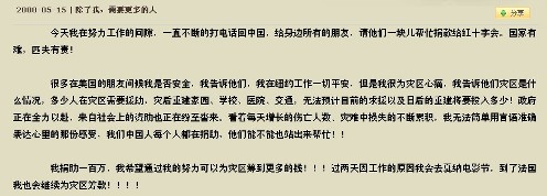 在2008年地震發(fā)生后,北京的同事接到子怡捐100萬(wàn)的指示后,他們分別給紅十字會(huì)捐了兩筆錢。我們當(dāng)時(shí)都不在國(guó)內(nèi),我也沒盯這事。但在最近兩個(gè)星期看到媒體報(bào)道說(shuō)捐款總數(shù)沒有達(dá)到100萬(wàn),我便開始調(diào)查此事。當(dāng)我尋找捐款收據(jù)時(shí),才發(fā)現(xiàn)一直沒有。今天紅十字會(huì)告訴我,捐款的收據(jù)一直在紅十字會(huì)那邊,因?yàn)樗麄儧]有寄出收據(jù)的地址。當(dāng)我了解到收據(jù)細(xì)節(jié)時(shí),才確認(rèn)了善款只有84萬(wàn)元。同時(shí)再了解到當(dāng)時(shí)會(huì)計(jì)和另一個(gè)同事她們?cè)诟髯詤R出金額上出現(xiàn)了紕漏,都以為對(duì)方匯出了差額。