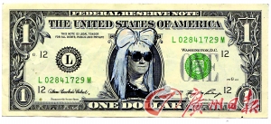 Lady gaga可謂紅得發(fā)紫,日前,美國(guó)畫(huà)家克里斯·格里森將印有美國(guó)第1任總統(tǒng)喬治·華盛頓頭像的1美元鈔票,篡改成Lady gaga的經(jīng)典造型。