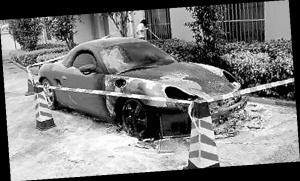 2010年2月26日凌晨,這輛跑車在南寧市錦繡江南小區(qū)內(nèi)蹊蹺起火。