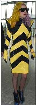 據(jù)臺灣媒體報道,美國女星LadyGaga近日出現(xiàn)在倫敦機場時,竟穿著活像交通標(biāo)志的黃底黑條紋洋裝一件,很顯然她決定要自己為自己開道,以減少不必要的支出。
