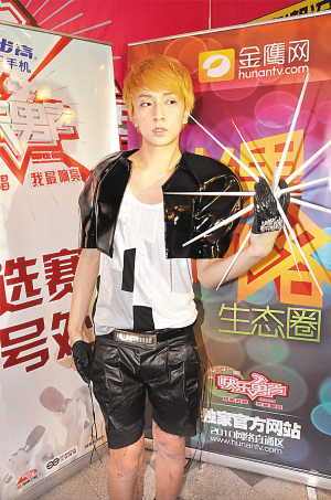 前天下午,快男成都唱區(qū)來了一位戴著墨鏡、身穿盔甲的選手報(bào)名,其雷人的造型立即引來眾人圍觀。在填寫報(bào)名資料時(shí),工作人員才發(fā)現(xiàn)原來這位個(gè)性選手就是2007年火爆全國的型秀冠軍師洋。三年不見,師洋的裝扮和舉止雷人依舊,而當(dāng)天的盔甲造型也讓他看上去更有霸氣。