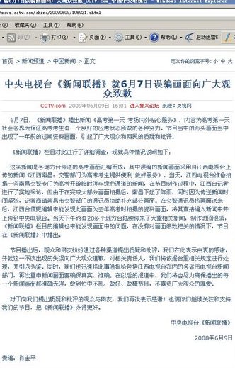 2天后的6月9日,央視在官方網站首頁的顯要位置,發(fā)表“中央電視臺‘新聞聯(lián)播’就6月7日誤編畫面向廣大觀眾致歉”的消息。