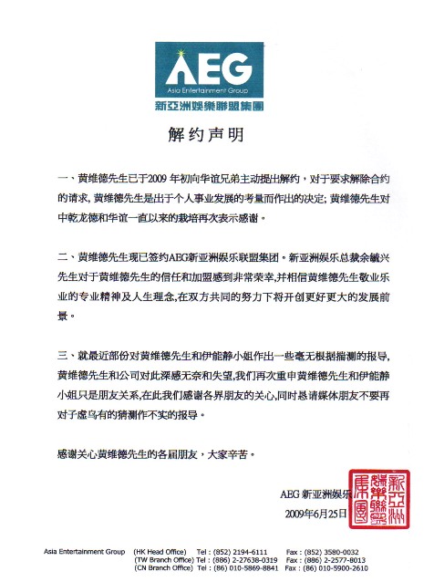 AEG新亞洲娛樂(lè)聯(lián)盟集團(tuán)的聲明指,黃維德先生已于2009 年初向華誼兄弟主動(dòng)提出解約,對(duì)于要求解除合約的請(qǐng)求, 黃維德先生是出于個(gè)人事業(yè)發(fā)展的考慮而作出的決定。