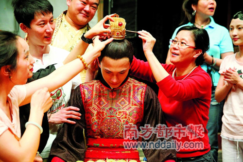 李少紅執(zhí)導的新版《紅樓夢》歷經(jīng)一年三個半月的緊張拍攝,終于在昨日殺青!皩氂瘛睏钛笠苍谶@一天迎來了自己的18歲成年生日。昨日,劇組殺青之日,導演李少紅與近百名演職人員一起,為“成年寶玉”楊洋舉行了熱鬧的成人禮。李少紅親手為楊洋摘下通靈寶玉,象征劇組正式殺青;隨后,李少紅又為楊洋戴上金冠,取意“加冠成人”(左圖)。楊洋感動得語帶哽咽:“18歲生日在劇組度過,我覺得很有意義。它對劇組的拍攝工作是一個圓滿的終點,但對于我個人來說,卻是人生新的起點。”