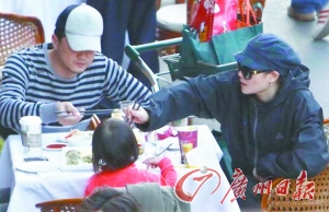 當(dāng)天下午4時(shí)左右,記者在東三環(huán)某商場(chǎng)內(nèi)看到天后王菲在挑水果,小女兒李嫣和戴著棒球帽、身穿休閑服的李亞鵬也在商場(chǎng),購(gòu)物之后三人直接來(lái)到商場(chǎng)旁邊的一家餐廳和朋友吃飯,在餐廳外的露天餐桌上就座,點(diǎn)了煎餃、粉絲煲等菜。不過(guò)王菲全程沒(méi)有吃東西,李亞鵬卻是筷子不離手,看樣子是餓壞了。而小李嫣也毫不認(rèn)生,自己拿筷子夾菜吃。 (余樂(lè))