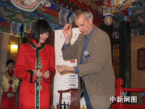 中新網(wǎng)11月25日電 昨天(24日),北京電視臺2010年“環(huán)球春晚”正式簽約美國著名魔術(shù)師大衛(wèi).威廉姆森儀式在北京全聚德烤鴨店舉行。和因春晚一炮而紅的劉謙一樣,來自美國的大衛(wèi)最擅長近臺魔術(shù),被譽(yù)為是“魔術(shù)盛典靈魂人物”。在簽約儀式上,大衛(wèi)以他風(fēng)趣幽默的個(gè)人風(fēng)格和在場的魔術(shù)愛好者過招,在觀眾眼前近距離地用撲克牌和順手拿起的筷子展示了自己嫻熟的手法。