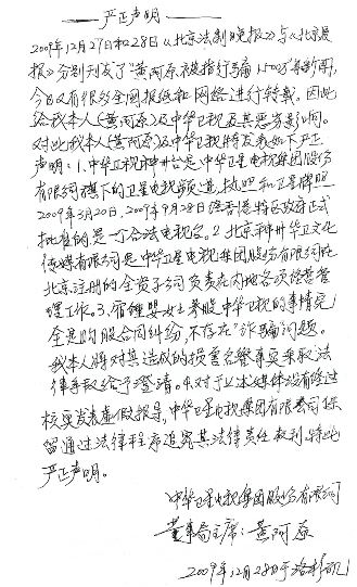 4,對于有關(guān)媒體沒有經(jīng)過核實發(fā)表“虛假報道”,中華衛(wèi)星電視集團有限公司保留通過法律程序追究其法律責(zé)任的權(quán)利。