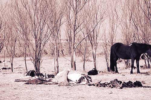 記者6日來到拍攝現(xiàn)場,發(fā)現(xiàn)一大片平整的濕地上異常熱鬧,十多匹高頭大馬正在不停地啃著野生紅柳的樹皮,約30多臺各種車輛停放在濕地上,地上到處是垃圾和隨手扔掉的黑白塑料袋……