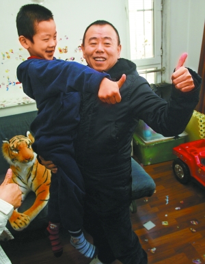 昨天上午,在本報(bào)記者和信報(bào)記者的陪同下,抱著一只玩具老虎的潘長(zhǎng)江來(lái)到了位于南四環(huán)的韜寶家中。潘長(zhǎng)江的到來(lái)讓韜寶的父母格外欣喜感動(dòng),但以往只在電視里見(jiàn)過(guò)潘長(zhǎng)江的小韜寶起初有些“認(rèn)生”。不過(guò),當(dāng)他一眼看見(jiàn)潘長(zhǎng)江手中的CD時(shí),立刻興奮得一躍而起,拿過(guò)CD就急著要播放。尤其當(dāng)他聽(tīng)到《過(guò)河》的旋律時(shí),更是興奮地滿地打滾,并模仿起潘長(zhǎng)江在《過(guò)河》中的表演。