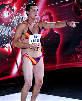 《美國偶像》從來不乏惡搞歌手,去年出了個(gè)比基尼女孩,今年又出了個(gè)比基尼猛男。周二晚,在節(jié)目進(jìn)行過程中,參賽選手泰·海默靈(Ty Hemmerling)身著比基尼泳衣登臺(tái)獻(xiàn)唱,驚得眾評(píng)委目瞪口呆。