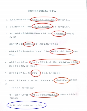 在清單里能看到的部分內(nèi)容包括,“現(xiàn)場嘉賓桌擺放贊助飲料娃哈哈飲用水、蒙牛牛乳飲料,給予鏡頭展示”;“互動主持臺立面設(shè)計上體現(xiàn)‘中國平安·平安中國’字樣,給予鏡頭展示”;“春晚工作人員穿著喬丹贊助的服裝,春晚現(xiàn)場給予鏡頭展示”;“佳能相機(jī)作為道具出現(xiàn)在歌舞《拍拍拍》節(jié)目中,相機(jī)及相機(jī)掛帶上的logo在鏡頭中出現(xiàn)”;“小品節(jié)目《50塊錢》中,魯花食用油在面案或小桌上擺放,貼有企業(yè)Logo的圍裙作為道具由演員使用,給予鏡頭展現(xiàn)”;“劉謙近景魔術(shù)節(jié)目中,使用匯源果汁作為道具,給予鏡頭展示”;“趙本山演出的小品節(jié)目中帶有企業(yè)的logo的瀘州老窖禮盒作為道具由演員使用,給予鏡頭展示。”