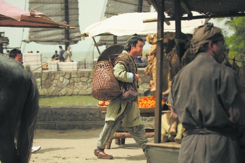 小沈陽的第一場重頭戲是他所扮演的小鞋匠在碼頭上巧遇一位白胡子老翁,受其一番指點(diǎn)和教導(dǎo),這位老翁也是江湖一位武俠高手,之后和趙本山所扮演的河盜一起把武功秘籍傳授給小沈陽。這場戲選擇在無錫影視基地的太湖碼頭拍攝,碼頭邊?恐鴶(shù)艘巨大的帆船,小沈陽進(jìn)入狀態(tài)非?,這場戲拍攝得也相當(dāng)順利,連在旁觀看的趙本山也忍不住面帶微笑。