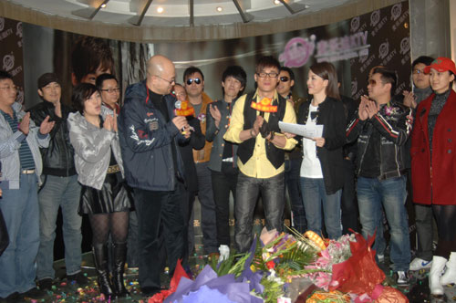 作為黃勇這張全新專輯的監(jiān)制,同時也是黃勇老板兼大哥的齊秦因為臨時有事沒能來到發(fā)布會現(xiàn)場,但通過VCR送上了他特別的祝福。齊秦對黃勇音樂給予了極大的肯定和祝福。黃勇的好友龐龍、尹相杰、熊天平等也通過VCR送上了祝福。北京圣天驕影視文化藝術(shù)有限公司老總李繼宏也送上了一份精心準(zhǔn)備的寓意深刻的禮物——金話筒,希望黃勇把他的歌聲通過這只金話筒帶給全世界所有喜歡他音樂的朋友。(李學(xué)仕)