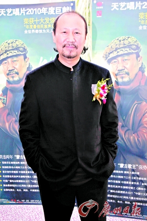 昨天,帶著暌違兩年多的新專輯《云中的月亮》來到現(xiàn)場的“蒙古歌王”騰格爾最受媒體關(guān)注。和以往的風格不同的是,新專輯海報和唱片封面上的騰格爾身穿皮衣,頭戴一頂鴨舌帽格外扎眼。在接受采訪時,騰格爾笑著說這張專輯除重新編配了一些老歌,主要是他近兩年來的新作,少了些蒙古味,多了點時尚感,而封面新造型也同樣是一次大膽嘗試!罢麖垖]嬘6首詞和8首曲都是我自己寫的,和以往相比,這張新作比較大眾化!
