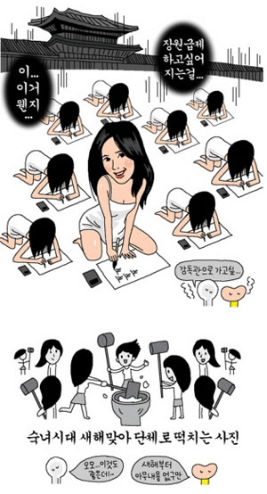漫畫中的“淑女時代”在話語、人數(shù)、穿著和人物描寫方面與韓國當紅組合“少女時代”非常相似。少女時代的粉絲們對此感到憤怒,認為漫畫中人物過去的服裝、姿勢、“打糕”等描述以及與畫面下方男性的對話內(nèi)容,明顯是性騷擾。