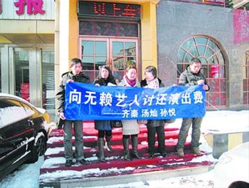 昨日上午,沈陽(yáng)一文化公司的5名員工在北三經(jīng)街鬧市區(qū)拉出條幅:“向無(wú)賴藝人討還演出費(fèi)!”條幅下列出了三名藝人的姓名:齊秦、湯燦、孫悅。