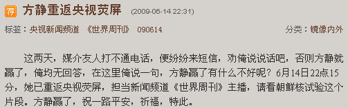 這兩天,媒介友人打不通電話,便紛紛來短信,勸俺說說話吧,否則方靜就贏了,俺均無回答,在這里俺說一句,方靜贏了有什么不好呢?6月14日22點(diǎn)15分,她已重返央視熒屏,擔(dān)當(dāng)新聞?lì)l道《世界周刊》主播,請看朝鮮核試驗(yàn)這個(gè)片段。方靜贏了,祝一路平安,祈福,特此。